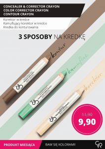 Aż trzy różne rodzaje kredek są produktem miesiąca w marcu. Są to, korektor w kredce, kamuflujący korektor w kredce oraz kredka do konturowania. Wszystkie trzy produkty przez cały miesiąc dostępne są w nowej, niższej cenie.