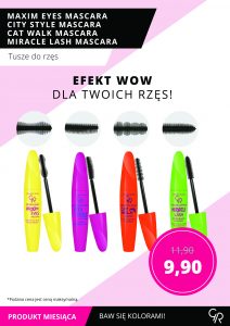 City Style Mascara – Dzięki niemu wydłużymy i pogrubimy nasze rzęsy. Produkt idealnie przylega do rzęs, nie zbija się w grudki, nie kruszy się i nie rozmazuje. Posiada elastyczną szczoteczkę wyposażoną  w dwa rodzaje włosków: dłuższe włoski maksymalnie wydłużają i podkręcają, a krótsze dodają objętości. Asymetryczna budowa szczoteczki zapewnia również równomierne i precyzyjne rozprowadzenie tuszu, dzięki czemu podkreśla nawet najkrótsze włoski z kącikach oka.
