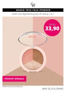 Baked Trio Face Powder – Wypiekane pudry do twarzy 3 w 1 z naszej serii Nude Look, to kompaktowy, uniwersalny i elegancki zestaw trzech produktów: rozświetlacz, róż, bronzer, które świetnie sprawdzą się w przygotowaniu wiosennego makijażu. Są to kosmetyki, które królują niemal w każdej kobiecej kosmetyczce. Dzięki nim w łatwy i szybki sposób wykończymy makijaż nadając skórze promiennego blasku.