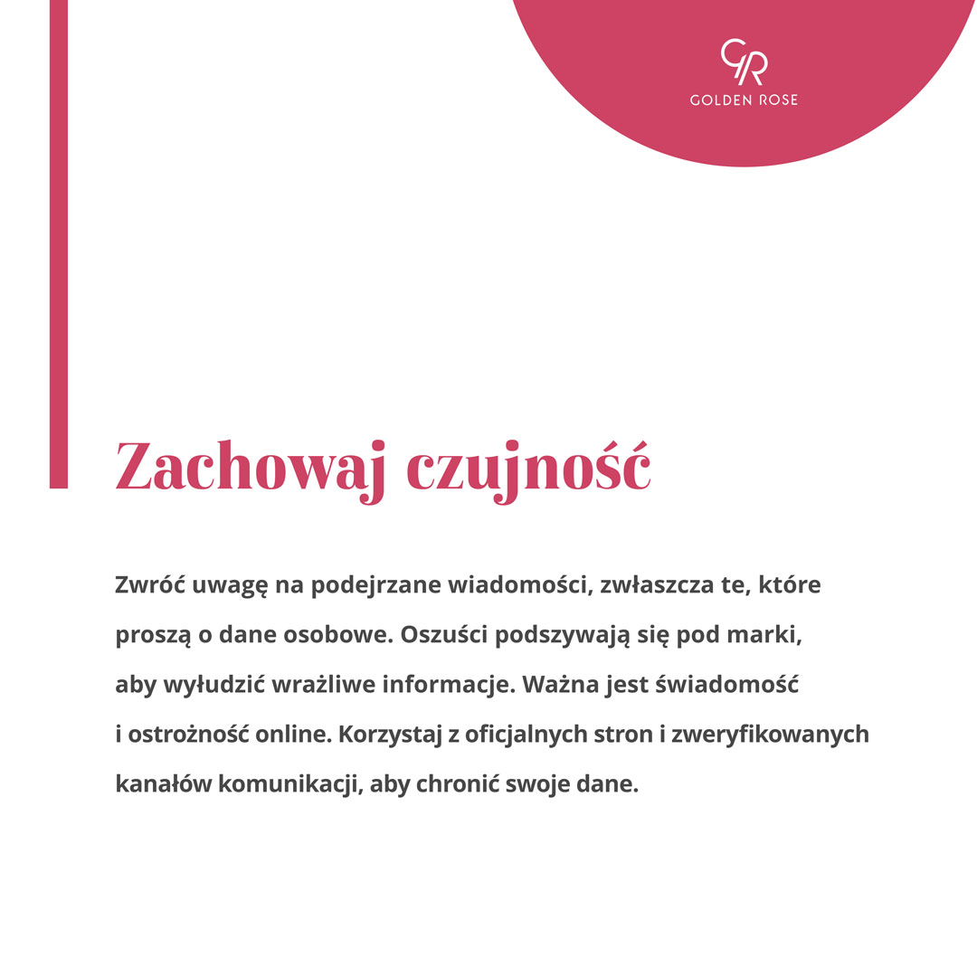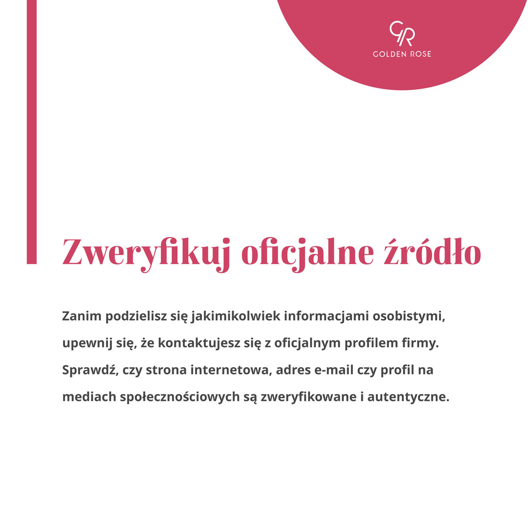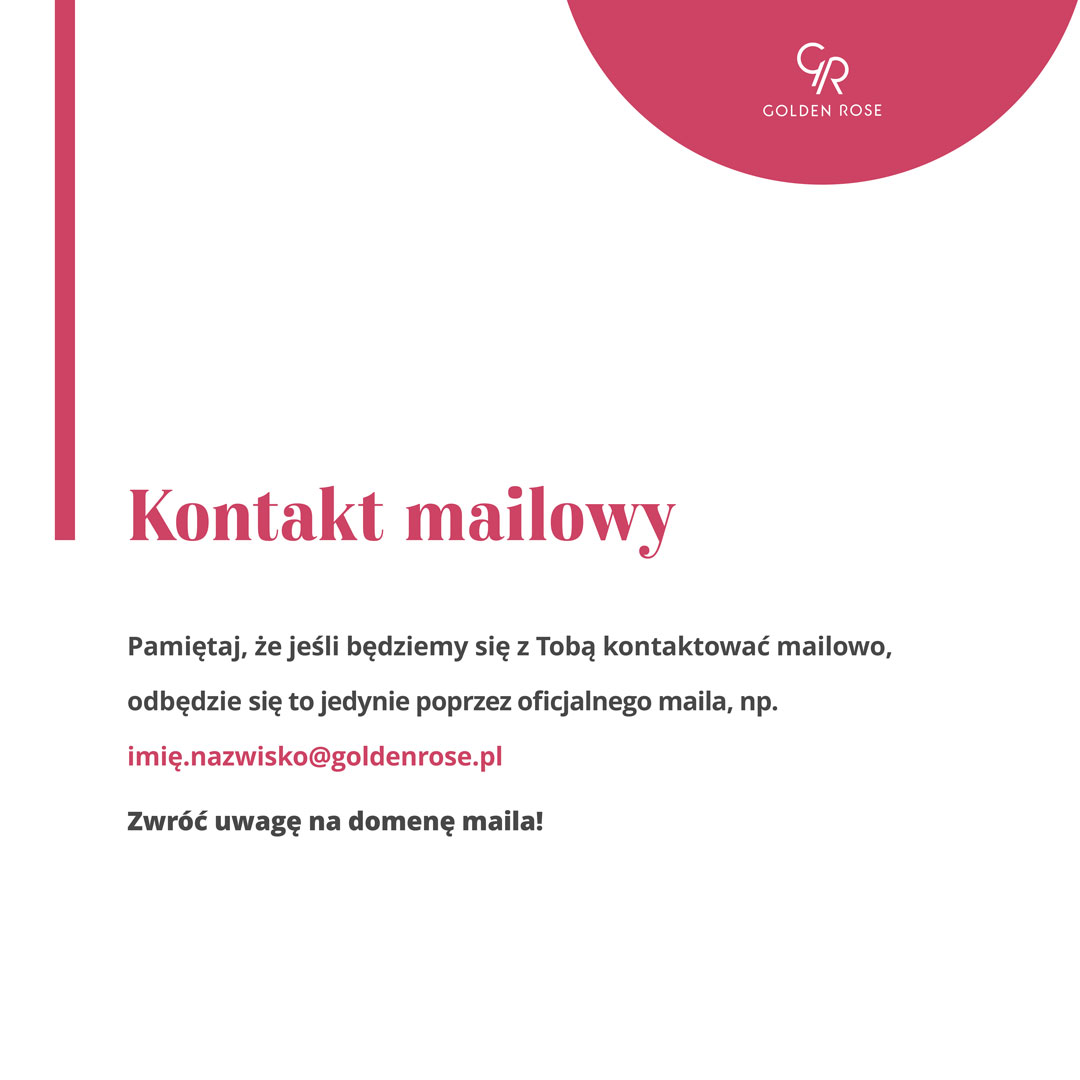 Wymieniając korespondencję mailową z daną marką, należy zwrócić uwagę na domenę maila, aby mieć pewność z kim piszemy. W firmowych adresach mailowych zazwyczaj umieszczona jest nazwa firmy. W naszym przypadku maile wyglądają w następujący sposób: imię.nazwisko@goldenrose.pl